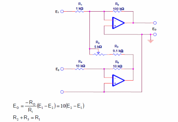 En este circuito encontrado en una documentación de Texas Instruments de 2016 tenemos un ajuste para el rechazo en modo común. El circuito hace uso de dos operacionales que pueden ser de cualquier tipo. Las fórmulas junto al diagrama permiten cambiar el circuito a otros comportamientos.