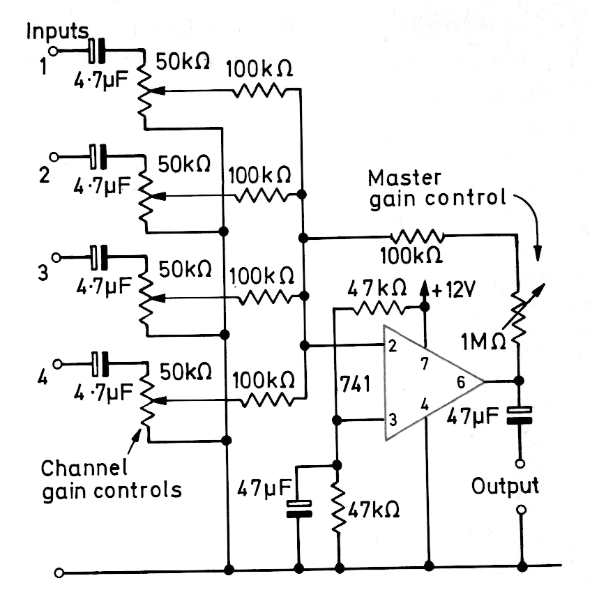 Este mezclador también puede ser implementado con amplificadores operacionales más modernos, tipos que hasta requieren tensiones menores de alimentación y tienen menor distorsión. Los cables de entrada y salida de señales deben ser blindados.