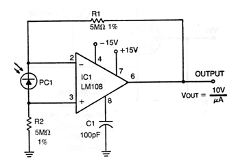 El amplificador operacional indicado en este circuito de una documentación antigua ya no se utiliza actualmente. Se puede utilizar un amplificador equivalente de mejor rendimiento y la alimentación se puede hacer con una tensión más baja. La ganancia es de 10 V para cada microampère de corriente en el diodo. El circuito requiere componentes de precisión si la aplicación es más crítica.