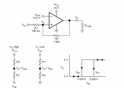 El circuito integrado TLV7011 es un comparador de tensión de Texas Instruments para operación con bajas tensiones y bajo consumo. El circuito presentado abajo es del manual de ese componente y tiene una característica de histéresis.