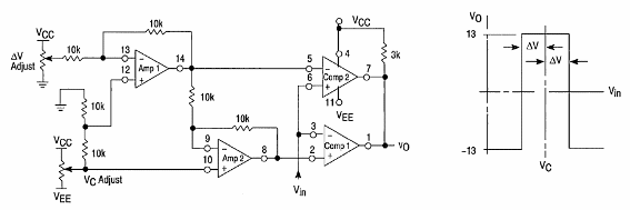 Este circuito hace uso de comparadores y operacionales comunes, habiendo sido encontrado en el Linear Interfaz IC de Motorola de 1993. El circuito requiere una fuente simétrica.