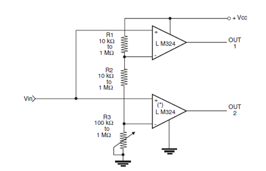 Dos comparadores se pueden utilizar para detectar dos niveles de tensión diferentes ajustados en R3 y determinados también por R1 y R2. En la figura mostramos cómo hacerlo. Se pueden utilizar otros comparadores. El circuito es del libro Robotics, Mechatronics y Artificial Intelligence de Newton C. Braga.