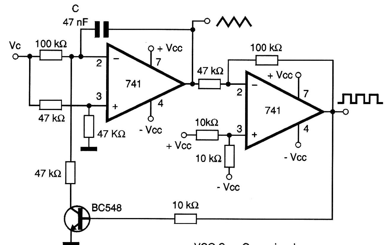 Dos amplificadores operacionales como el 741 o equivalentes se utilizan en este oscilador controlado por tensión para frecuencias de hasta algunos quilohertz determinados por C. El circuito debe ser alimentado con una fuente simétrica de 6 a 12 V y tenemos dos tipos de señales en las que: salidas: una forma de onda triangular en la salida del primer operacional y una salida rectangular en el segundo operacional. El rango de tensiones de entrada que permite un rango de control de 1:10 en la frecuencia, se encuentra entre 0 y la tensión de alimentación positiva del circuito.