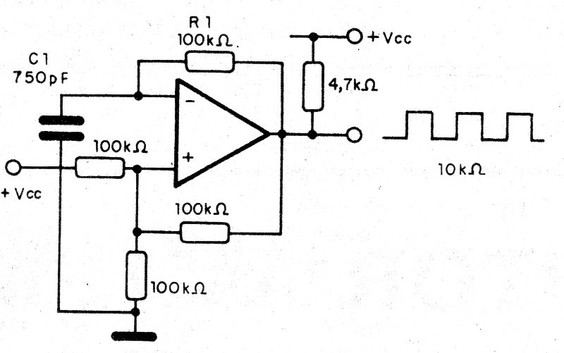 Este oscilador utiliza cualquier comparador de tensión como los de la serie 139/239/339, generando señales rectangulares hasta algunas decenas de quilohertz. La alimentación se puede realizar con tensiones de 3 a 12 V.