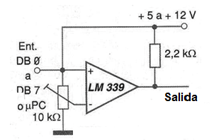 Una solución interesante que puede darse en algunos casos es la que se muestra en la figura en la que se emplea un trimpot de ajuste. Este trimpot de ajuste permite llevar el nivel de transición de la señal de la puerta en la que se obtiene el disparo al valor ideal. Esto permite que incluso microprocesadores que suministran tensiones menores de salida en sus puertas, como algunas versiones modernas que suministran señales de 2,7 V o 3,3 V también pueden ser usadas en la interfaz de circuitos externos, sin la necesidad de cambiar el circuito . Se observa que los resistores de referencia se calcularon para dos tensiones de alimentación del comparador: 6 V y 12 V. Para otras tensiones el lector puede hacer el cálculo, recordando que para una salida de disparo de 5 V, el nivel de la tensión de referencia debe ser de 2,5 V. Recuerde que las salidas de los comparadores LM139 / 239/339 son en colector abierto, exigiendo una resistencia pull-up. La corriente máxima drenada por la salida es de 16 mA (tip) para una alimentación de 5 V. Con ello, este paso puede excitar directamente transistores y otros dispositivos, con facilidad.