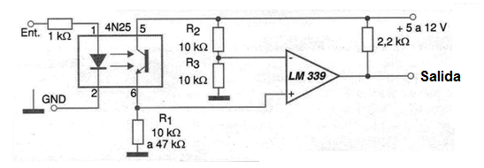 En la figura tenemos una interfaz usando un acoplador óptico y el comparador LM339 o cualquier equivalente. En esta aplicación, los amplificadores operacionales también se pueden utilizar. El punto de disparo se puede ajustar en el trimpot de 10 k ohms, sin embargo, nada impide que tengamos un disparo fijo, colocando en este punto un divisor resistivo con dos resistores de 10 k ohms. Recuerde que los comparadores de la serie LM139/239/339 poseen transistores en colector abierto, así que se debe utilizar una resistencia pull-up y la corriente es drenada por la salida cuando va al nivel bajo. La alimentación del sector del comparador puede ser hecha con fuente separada y tensión diferente de 5 V.