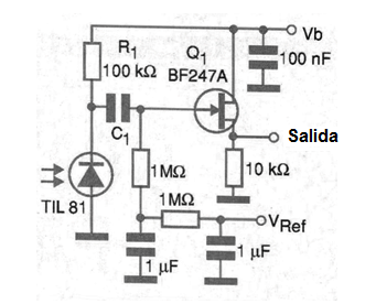 En el circuito mostrado en la figura el diodo opera en el modo generador, es decir, generando una tensión de señal cuando incide la radiación modulada. Esta tensión aparece sobre el resistor de carga R1 y se aplica a la conducción del transistor de efecto de campo de unión a través del capacitor C1. Los valores de los resistores se determinan por las características de la señal que debe ser captada y por el foto-diodo usado.