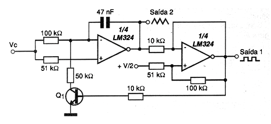 El circuito mostrado en la figura utiliza dos de los cuatro amplificadores operacionales encontrados en el circuito integrado LM324. La mayoría de los amplificadores operativos comunes se pueden utilizar en la misma configuración, dependiendo de sus características sólo el límite del rango de frecuencias generadas. La frecuencia central del circuito es dada por el capacitor y el transistor usado puede ser cualquiera de uso general como el BC548. La tensión de control puede variar entre 0 y 50 V típicamente, ya que tenemos valores elevados de resistores en la entrada y un circuito limitador. El circuito tiene dos salidas en las que se obtienen señales triangulares y rectangulares. La fuente de alimentación no necesita ser simétrica, pero se debe observar la necesidad de una tensión de polarización V/2 (mitad de la tensión de alimentación) en la entrada positiva del segundo operacional. Esta tensión se puede obtener con un divisor formado por dos resistencias de 10 k ohms conectados en serie.