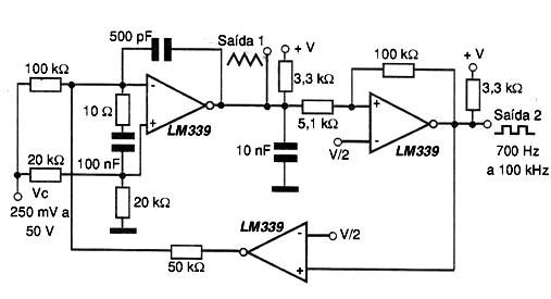Una configuración utilizando tres de los cuatro comparadores de tensión existentes en el LM339 se muestra en la figura y es sugerida por National Semiconductor. Este circuito genera señales de 700 Hz a 100 kHz, cuando la tensión de control (Vc) varía entre 250 mV y 50 V. El circuito también tiene dos salidas en las que se obtienen señales rectangulares y triangulares. Observe la necesidad de una polarización de V / 2 en dos puntos del circuito. Esta polarización se puede obtener con un divisor resistivo formado por dos resistores de 10 k ohms conectados en serie.