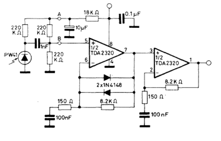 Este circuito está indicado para aplicaciones de control remoto con infrarrojos modulados. La alimentación es de 5 V y la salida compatible con la lógica TTL. El circuito es del manual de circuitos integrados lineales de la SGS de 1982.