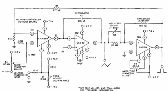 Este circuito es del manual de circuitos integrados lineales de la RCA de 1972, pero puede todavía ser montado con facilidad pues el CA3130 aún puede ser encontrado. El circuito cubre un rango dinámico de 1000 000 a 1 y debe ser alimentado por una fuente simétrica. El circuito genera señales triangulares y rectangulares.