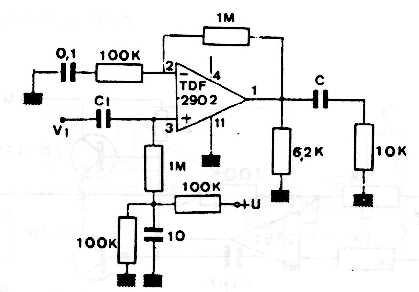 Este circuito se obtuvo en una antigua documentación europea. El circuito integrado utilizado es poco común actualmente, pero la configuración es válida para otros operacionales. Observe que la fuente no es simétrica. Su tensión depende del funcionamiento y de la aplicación.