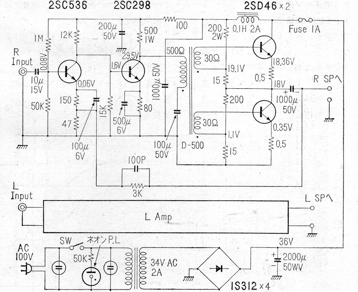 En la figura tenemos uno de los canales y la fuente de un buen amplificador estéreo de 20 W por canal de la década de 60. El circuito utiliza transistores de la época y un transformador controlador se utiliza para proporcionar la inversión de fase. El otro canal es idéntico.