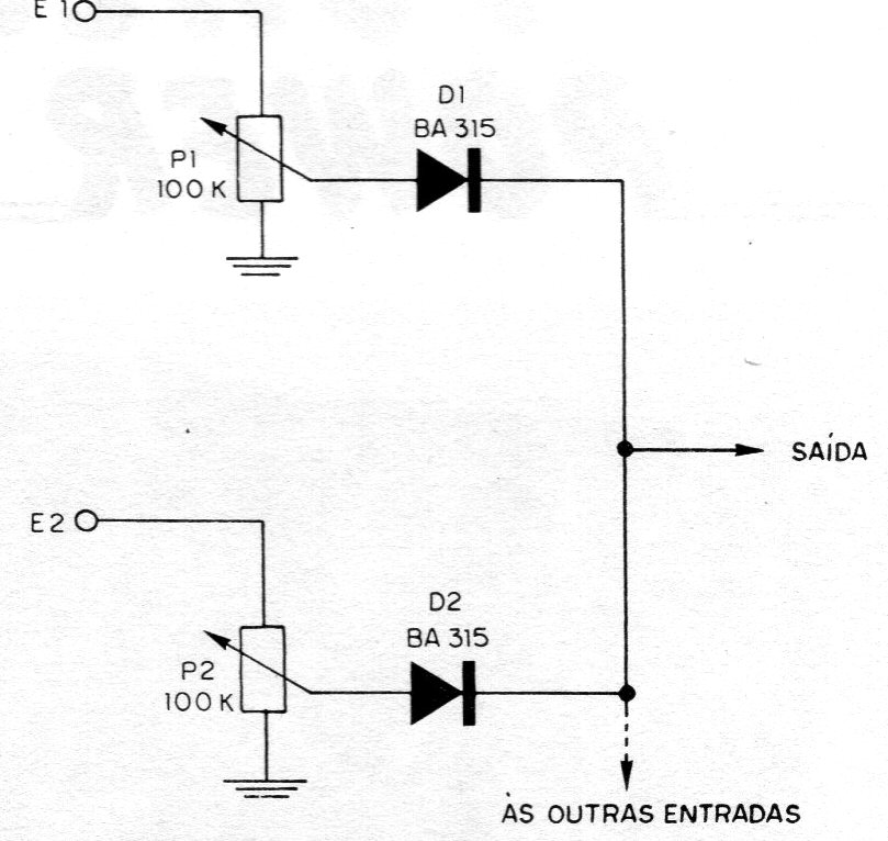 Este mezclador pasivo tiene una configuración que no siempre lleva a buenos resultados por el uso de los diodos. Obtenido en una documentación de 1982, tiene más una configuración experimental que debe ser verificada por los interesados. Mejor será sustituir los diodos por resistores de 47k o 100 k ohms.