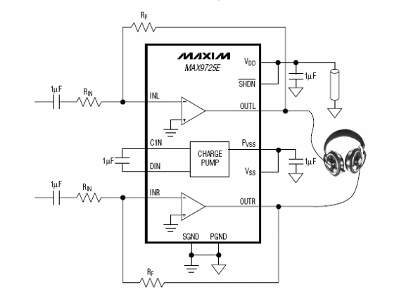 Utilizando un nuevo circuito integrado de Maxim (www.maxim-ic.com) el amplificador que presentamos en la figura puede ser alimentado por una sola pila. Los componentes de la serie que tienen prefijos de A hasta D con la ganancia programada con una potencia de salida de 20 mW por canal, utilizando fuentes de 32 ohms. La distorsión es de sólo 0,005% y tiene una función de cierre que le lleva a una condición de consumo muy baja. La corriente quiescente en condiciones normales es de 2,1 a 2,3 mA, dependiendo de la versión. El circuito presentado es la versión estéreo, pero el componente también se puede emplear en una versión BTL para una mayor potencia mono. En este circuito la relación entre los resistores de entrada y feedback determinan la ganancia. Los valores típicos de estos componentes se pueden obtener en el datasheet así como otras configuraciones posibles.