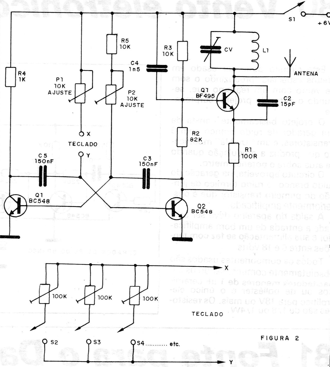 Este órgano electrónico inalámbrico se obtuvo en una documentación de 1987. Transmite los sonidos a un receptor de FM colocado cerca. Los ajustes se hacen en los potes y en el teclado hay trimpots individuales para la afinación. El circuito puede ser alimentado por tensiones de 6 a 9 V y la bobina consta de 4 espiras de hilo 26 o 24 en forma de 1 cm sin núcleo. El trimmer es común de 30 pF o menos.