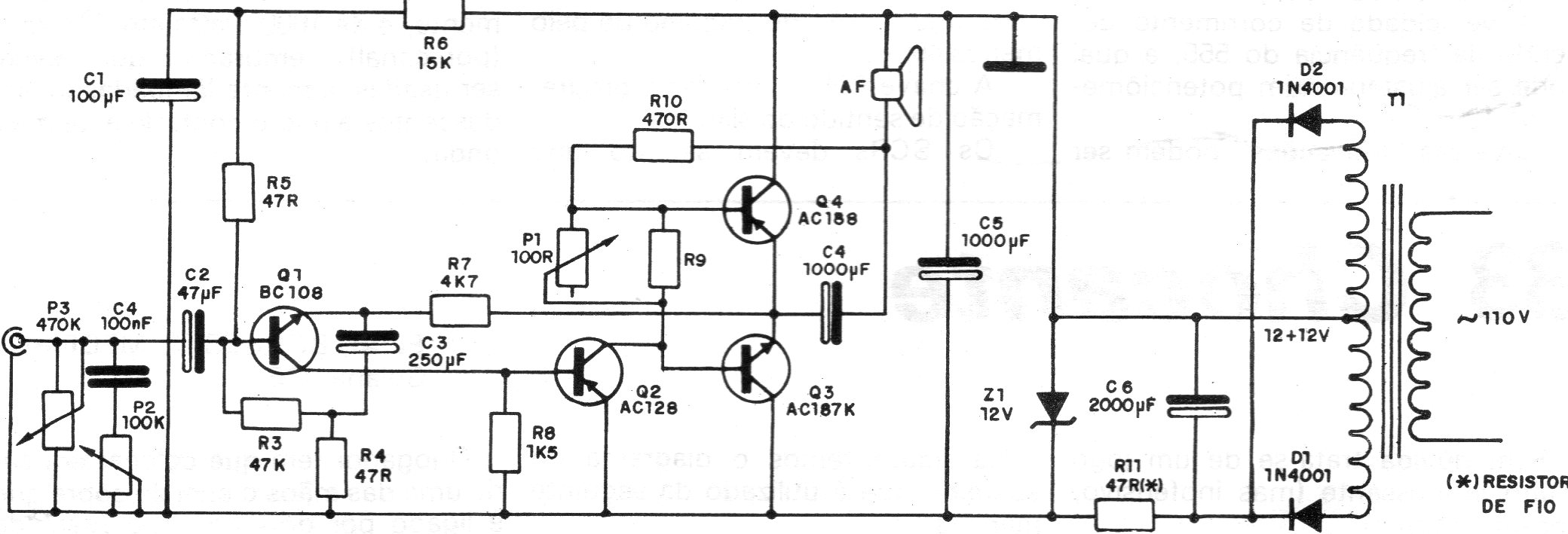Este amplificador de una documentación de 1987 utiliza antiguos transistores de potencia de germanio que todavía se pueden encontrar en algunos proveedores. El circuito proporciona una potencia de algunos vatios a un altavoz de buena calidad. El circuito incluye un control de volumen no convencional y un control simple de tono. El transformador debe tener una corriente de 800 mA a 1 A.