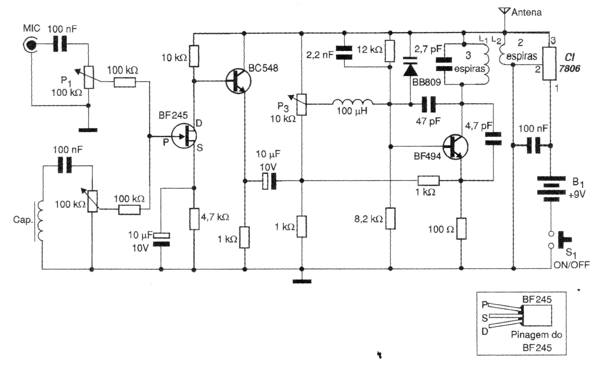 Este circuito de 2003 fue diseñado para ser instalado en una guitarra, aprovechando los captadores magnéticos de estos instrumentos para la transmisión de sonido, y usando un micrófono para la transmisión de voz sin la necesidad de cables. La primera etapa del aparato está formada por un preamplificador que recibe las señales de entrada y las mezclas en dosis determinada por el ajuste de P1 y P2. Después, estas señales se reproducen a un transmisor FM que los emite hasta un receptor común cuya salida se debe acoplar a un amplificador de audio. Así, el sonido reproducido tendrá la misma potencia del amplificador usado. El circuito es sintonizado por varicap lo que posibilita el ajuste de frecuencia en P3. Las bobinas L1 y L2 se hacen con hilo 18. L2 debe ser entrelazado en L1. Ambos tendrán forma de 1 cm de diámetro sin núcleo. Por tratarse de circuito de RF se recomienda que su montaje sea hecho en placa de circuito impreso, incluso los potenciómetros. La antena puede ser del tipo telescópico de radios portátiles. El condensador es el mismo utilizado en los instrumentos musicales usados. El montaje debe realizarse en caja de metal y los cables de entrada deben ser blindados para evitar la captación de zumbidos.
