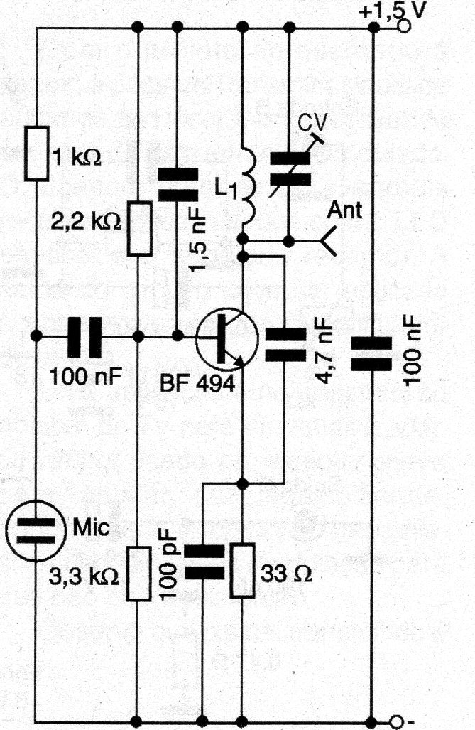 La bobina de este pequeño transmisor de FM que funciona como micrófono inalámbrico consiste en 4 espiras de hilo 24 o 26 en forma de 1 cm sin núcleo. El circuito es de una documentación de 2005 y utiliza un micrófono de electreto de dos terminales. La alimentación se puede realizar con una o dos pilas AAA.