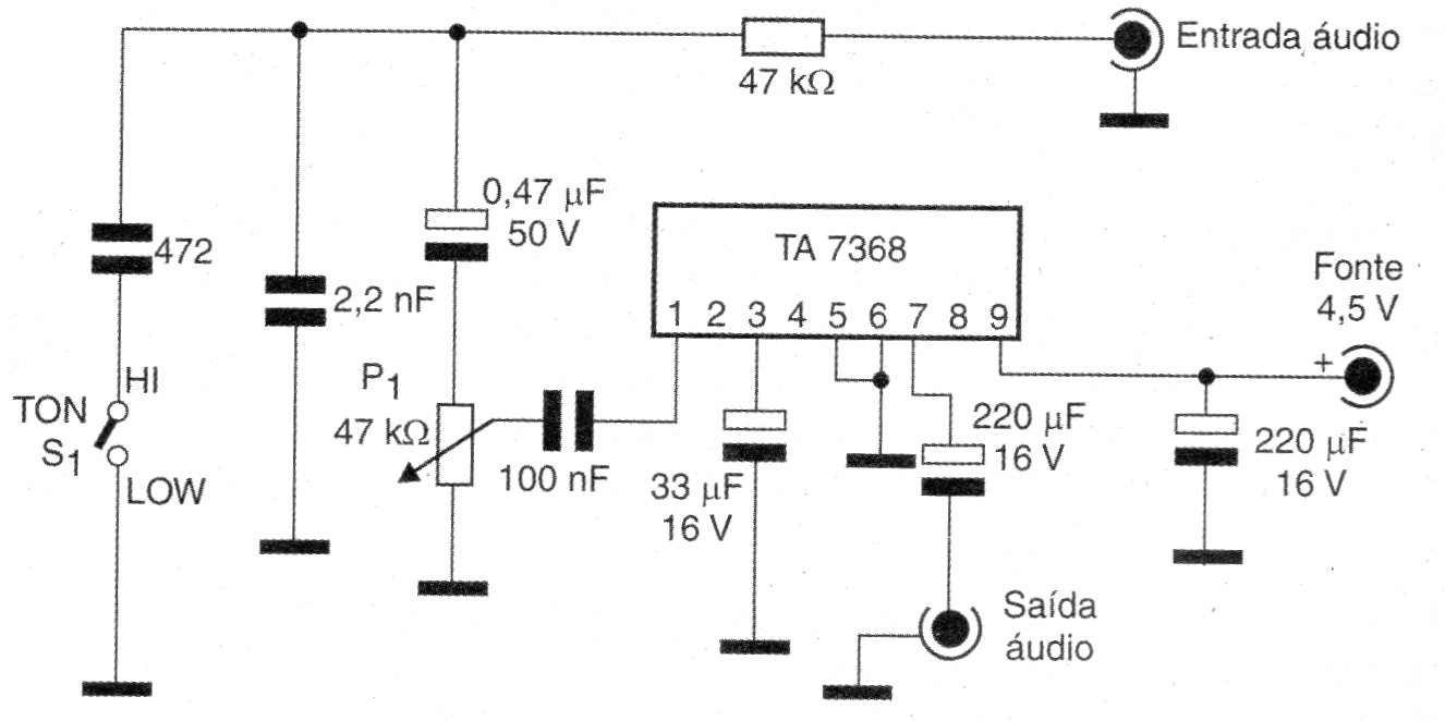El circuito presentado, de una documentación de 2005, puede suministrar de 1 W a 2,5 W de salida cuando es alimentado por tensiones entre 4,5 V y 6 V, siendo ideal para trabajos de banco. Los componentes son todos comunes. El potenciómetro P1 ajusta el volumen y en S1 podemos ajustar el tono para más grave o más agudo. El circuito integrado no admite el equivalente y la salida de audio se realiza en un altavoz de 4 a 8 ohms. El circuito integrado no necesita radiador de calor y los componentes polarizados deben tener sus posiciones observadas en el montaje. Para una versión estéreo basta con montar dos amplificadores iguales, siendo uno para cada canal. El cable de entrada de audio debe estar blindado para que no se produzca la captura de zumbidos.