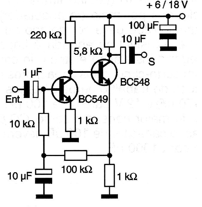 Sólo dos transistores se utilizan en este preamplificador para transductores poco sensibles, como captadores de guitarra y guitarras, micrófonos y otras aplicaciones de audio. La alimentación puede ser retirada del propio equipo con el que va a operar, ya que la corriente requerida es de pocos miliamperios no afectando así su funcionamiento. Los cables de entrada de señales deben ser cortos o blindados, y el transistor BC549 es recomendado por su bajo nivel de ruido. El nivel de la señal de salida llega a los 1 Vpp para una señal de entrada de 100 uV.