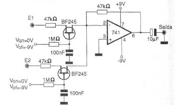 Este circuito de escudo puede servir de base para un mezclador digital o simplemente para un conmutador sin ruido de entradas de audio en una mesa de sonido, mezclador o incluso en una estación de radio experimental. La conmutación de las fuentes de audio en el circuito de la figura es hecha por la aplicación de tensión continua en las comportas de los transistores de efecto de campo. Los transistores conducen o no conducen las señales de audio, según el caso, aplicándolos al amplificador operacional de ganancia unitario. Observe que la fuente de alimentación debe ser simétrica y que es la resistencia de 47 k ohms entre la salida y la entrada inversora (pinos 6 y 2) que determina la ganancia del circuito. Este resistor se puede cambiar según la aplicación. Evidentemente se pueden experimentar otros amplificadores operativos y otros transistores de efecto de campo. Un punto interesante de este montaje es que los transistores pueden ser conectados de cualquier forma en relación a los terminales de drenaje y fuente, pues la corriente circula en los dos sentidos en la conducción. Para un mezclador digital, por ejemplo, se aplica en las entradas de conmutación las señales complementarias de un oscilador digital que debe operar en una frecuencia mayor que la del corte de audio.
