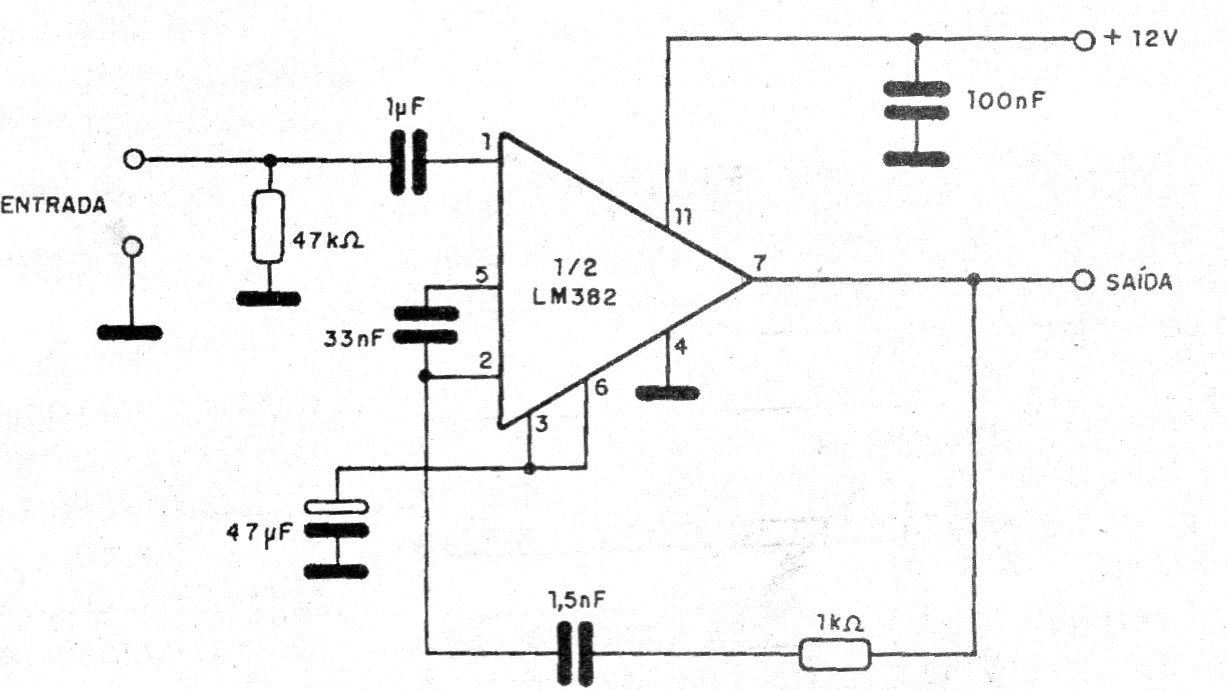 El circuito integrado utilizado en este preamplificador no es común en nuestros días, pero su calidad de sonido es excelente. La impedancia de entrada es de 47 k ohms y la ecualización es RIAA. El circuito es sugerido por National Semiconductor que ahora es una empresa de Texas Instruments. En la figura se muestra sólo un canal de un sistema estéreo.