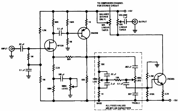 El circuito presentado fue obtenido en el Linear Applications Handbook de National Semiconductor de 1994. Los bipolares pueden ser comunes como los de la serie BC y el FET el BF245. La alimentación debe estar bien filtrada y los cables de señal tienen un excelente blindaje.