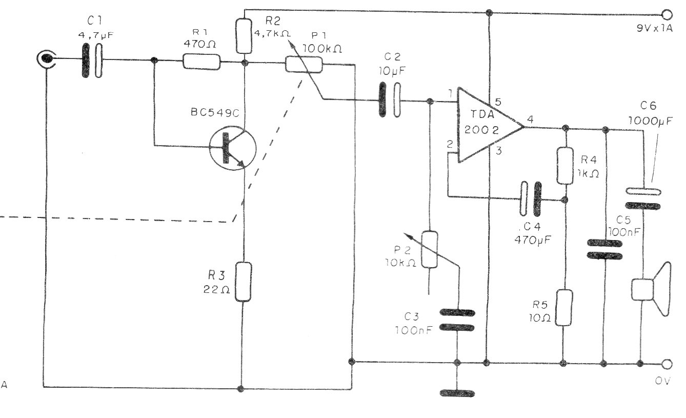 Originalmente en la publicación de 1992 este amplificador fue indicado para ser utilizado con tocadiscos. Sin embargo, en una aplicación moderna se puede utilizar con instrumentos musicales o incluso como caja de sonido multimedia para ordenadores. El circuito debe ser alimentado por fuente con transformador de 9 + 9 V con 1 A. El circuito integrado debe estar dotado de un disipador de calor. P1 se une al interruptor de fuente.