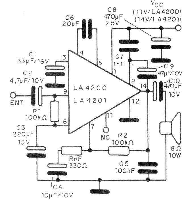 Este amplificador puede proporcionar potencias de 1,5 o 2,5 W según el circuito integrado utilizado. El circuito integrado no es muy común en nuestros días, pero en la época en que fue publicado el circuito (1992) era usado en equipos comerciales.