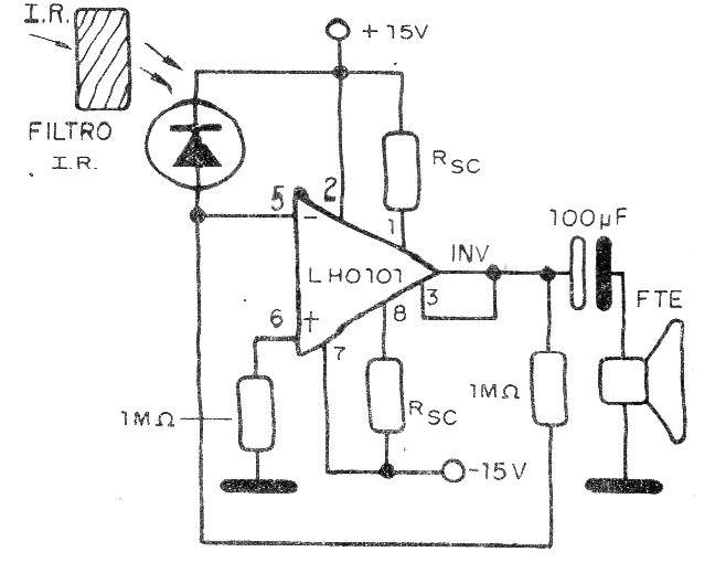 Este circuito fue encontrado en una documentación de 1992. Utiliza un foto-diodo como receptor y un circuito integrado no más común en nuestros días. El circuito recibe señales de audio que modulan infrarrojos y reproduce un altavoz.