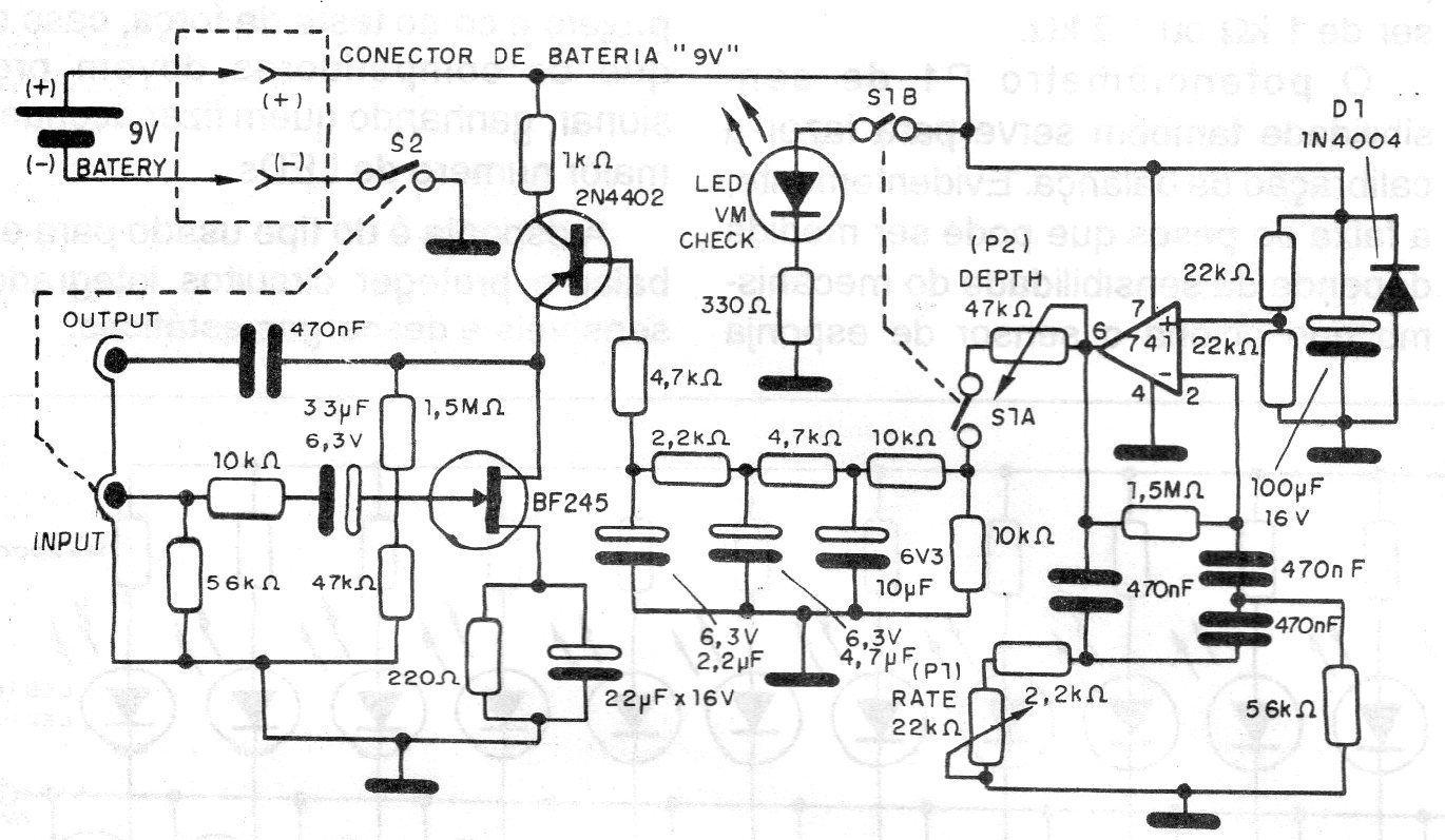 Este circuito fue encontrado en una documentación de 1992, pero utiliza componentes discretos que todavía se pueden encontrar con facilidad en nuestros días. El circuito es alimentado por la batería y el cuidado se deben tomar con los cables de audio para que no se produzca la captación de zumbidos. El efecto es controlado por los potenciômetros.