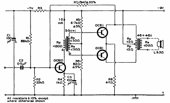 Esta antigua etapa amplificadora se encontraba en radios y pequeños amplificadores de la época. El circuito es del manual de referencia de transistores de Mullard.