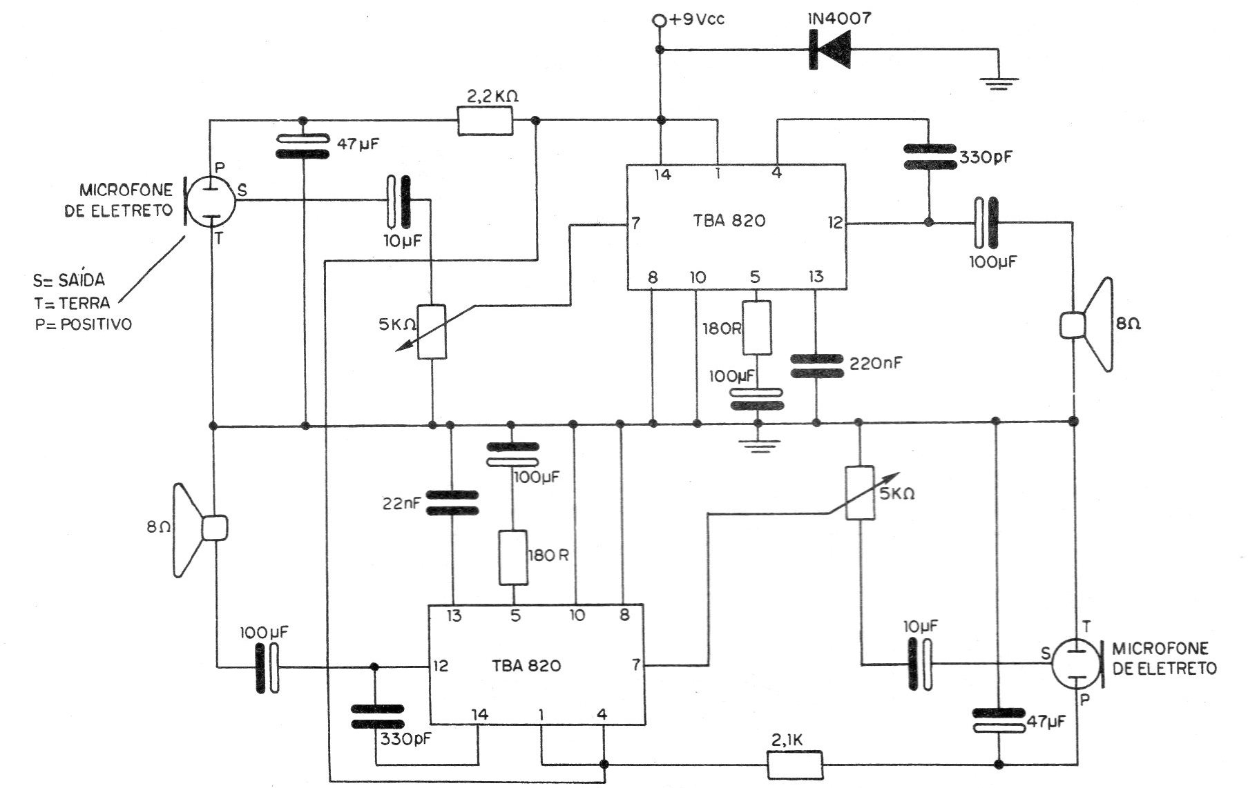 Es un intercomunicador de alta calidad para los lectores exigentes. El circuito es de una documentación de 1982. Evidentemente, el uso de dos circuitos integrados TBA820 más dos micrófonos de electreto, no hacen de este proyecto algo que pueda montarse con poco gasto. Su rendimiento, sin embargo, es de los mejores, en vista tanto de la calidad de los micrófonos usados, como de la ganancia y potencia de los amplificadores integrados. El circuito completo del intercomunicador se muestra en la figura. Los micrófonos de electreto utilizados son del tipo de tres terminales, ya bastante comunes en nuestro mercado especializado. Para una mayor calidad de sonido, los altavoces de 8 ohms deben tener un diámetro de al menos 10 cm. El autor del proyecto informa que la calidad de sonido se mantiene excelente con cables de hasta 20 metros de longitud, siendo esta la distancia máxima recomendada de separación entre las estaciones. El montaje, preferiblemente, debe ser hecho en placa de circuito impreso, en vista de la ganancia de los amplificadores. Las conexiones de los micrófonos deben realizarse con cable blindado, para evitar la captación de zumbidos. 0Las ganancias de las estaciones serán controladas en dos potenciómetros de 5k o 4k7. En el montaje el lector debe todavía observar que los micrófonos de electreto poseen tres terminados. La alimentación del circuito se realiza con una tensión de 9 V, que puede tanto venir de fuente como de pilas.