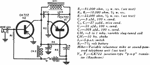 Este circuito es de un manual de Raytheon de 1950. Él muestra cómo montar un transmisor de AM de corto alcance usando el entonces recién lanzado CK722, primer transistor comercial del mundo. La bobina puede ser nerolada con 100 espiras de hilo 28 en un bastón de ferrita. Una antena se puede conectar al colector de V1.