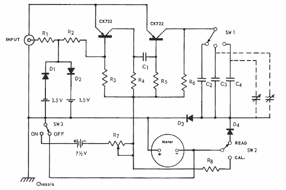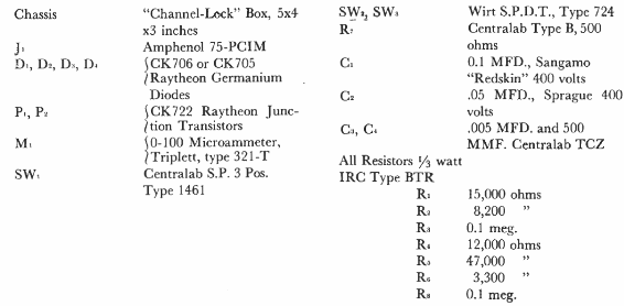 El circuito es de un manual de aplicaciones del CK722 de Raytheon de la década de 1950. El CK722 es el primer transistor comercial del mundo. El circuito indicado mide la intensidad de las señales de audio.