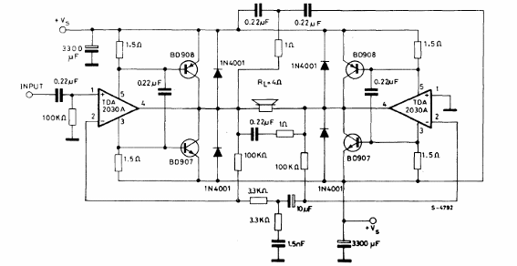 Con una alimentación simétrica de 20 + 20 V, este amplificador proporciona una potencia de salida de 120 W. El circuito utiliza transistores controladores en la salida que se pueden sustituir por equivalentes. El circuito es del manual de circuitos integrados lineales de la SGS.