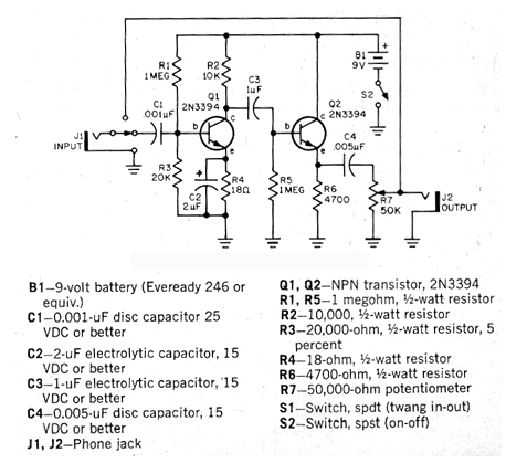 Este circuito fue sugerido por una edición de 1979 pero sigue siendo actual si utilizamos los transistores BC548. El circuito produce efectos de distorsión y refuerzo de agudos en el sonido de guitarra y guitarras cuyos captadores están conectados en su entrada. El circuito puede ser alimentado por batería de 9 V y tiene un consumo muy bajo. La entrada y salida de señales debe realizarse con un cable blindado.