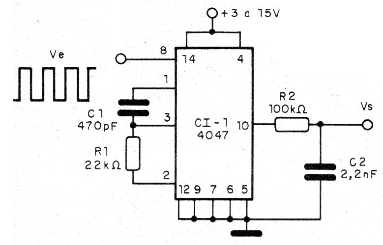 Este es un convertidor de tensión en frecuencia o D / A simplificado, pudiendo ser usado en instrumentación. El rango de tensiones de salida va de 0 a la alimentación. Las señales de entrada deben ser compatibles con CMOS. El circuito C1 y R1 depende del rango de frecuencia de entrada.