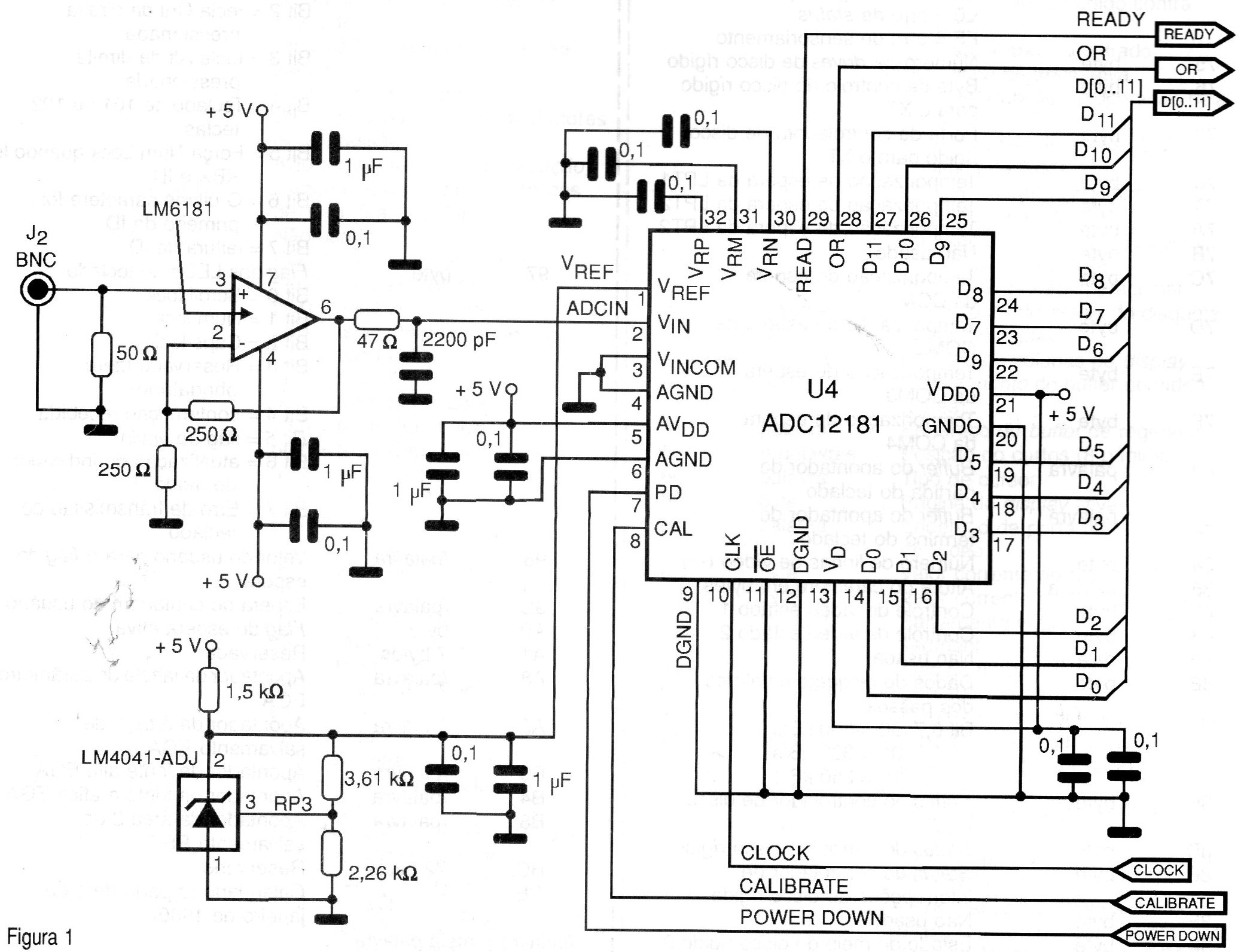 El convertidor A / D de alta velocidad ADC12181 está indicado para aplicaciones en procesamiento de imágenes, adquisición de datos para PCs, escáneres y escáneres de formas de onda. Una característica importante del ADC12181 de National es la inclusión de un circuito de muestreo y retención interna que facilita los proyectos. En el circuito de aplicación mostrado en la figura 1 todas las tensiones se deben aplicar simultáneamente. Como se trata de circuito de alta velocidad es muy importante tener cuidado con el diseño de las líneas de señal. Una precaución importante en esta aplicación es que tanto las tierras para las señales digitales como para los analógicos estén en los mismos niveles evitando el acoplamiento capacitivo entre ellos. La referencia de tensión es dada por un CI LM4041, y el amplificador operacional de alta velocidad LM6181 hace el acoplamiento de la fuente de señal externa al circuito convertidor de entrada.