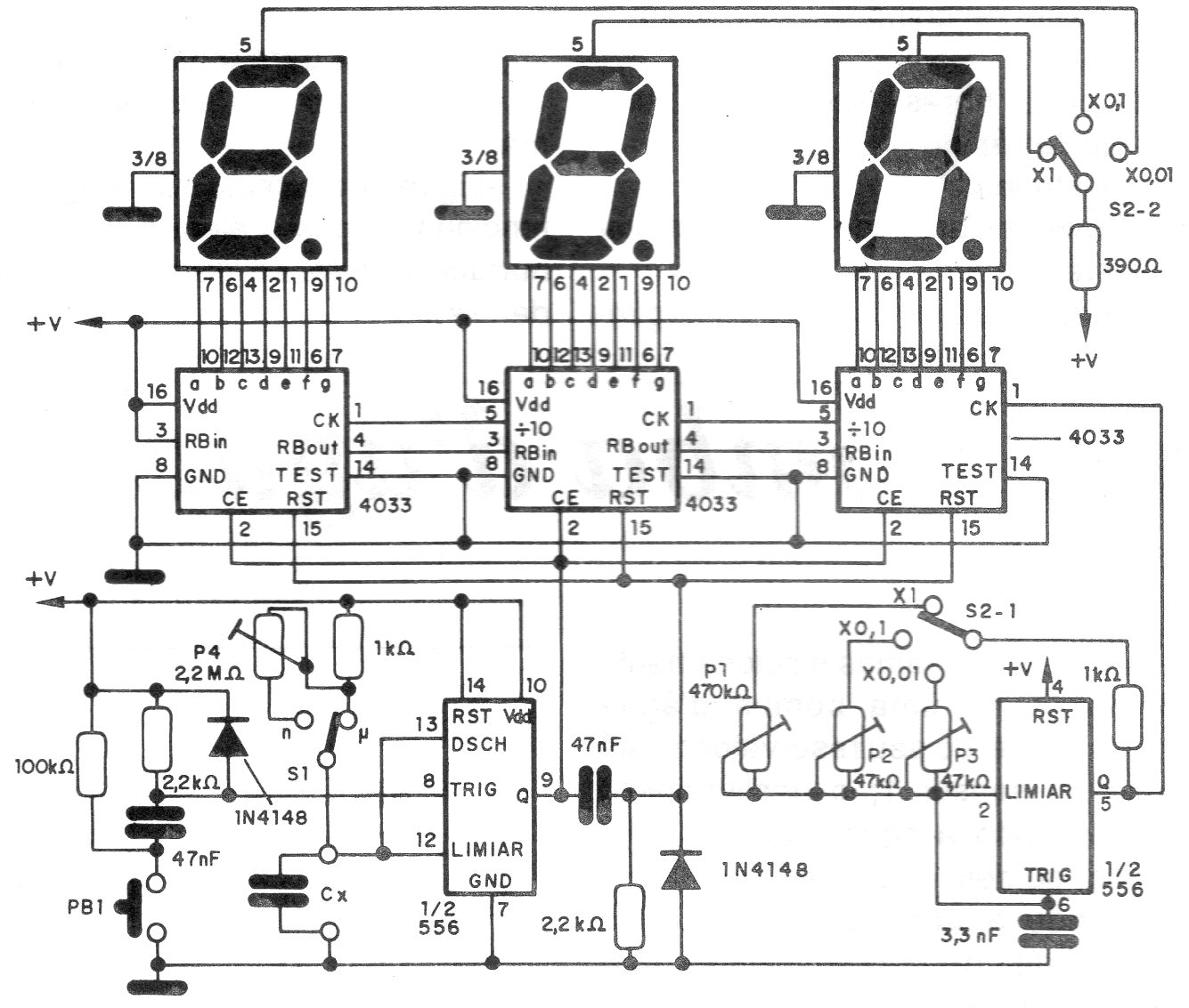 La precisión de este capacímetro digital de 3 dígitos depende de la tolerancia de los componentes usados y de los ajustes. El circuito es CMOS debiendo ser alimentado con tensiones de 6 a 9 V. Los displays son de cátodo común. El circuito mide capacitancias en tres escalas de 100 pF a 1 000.