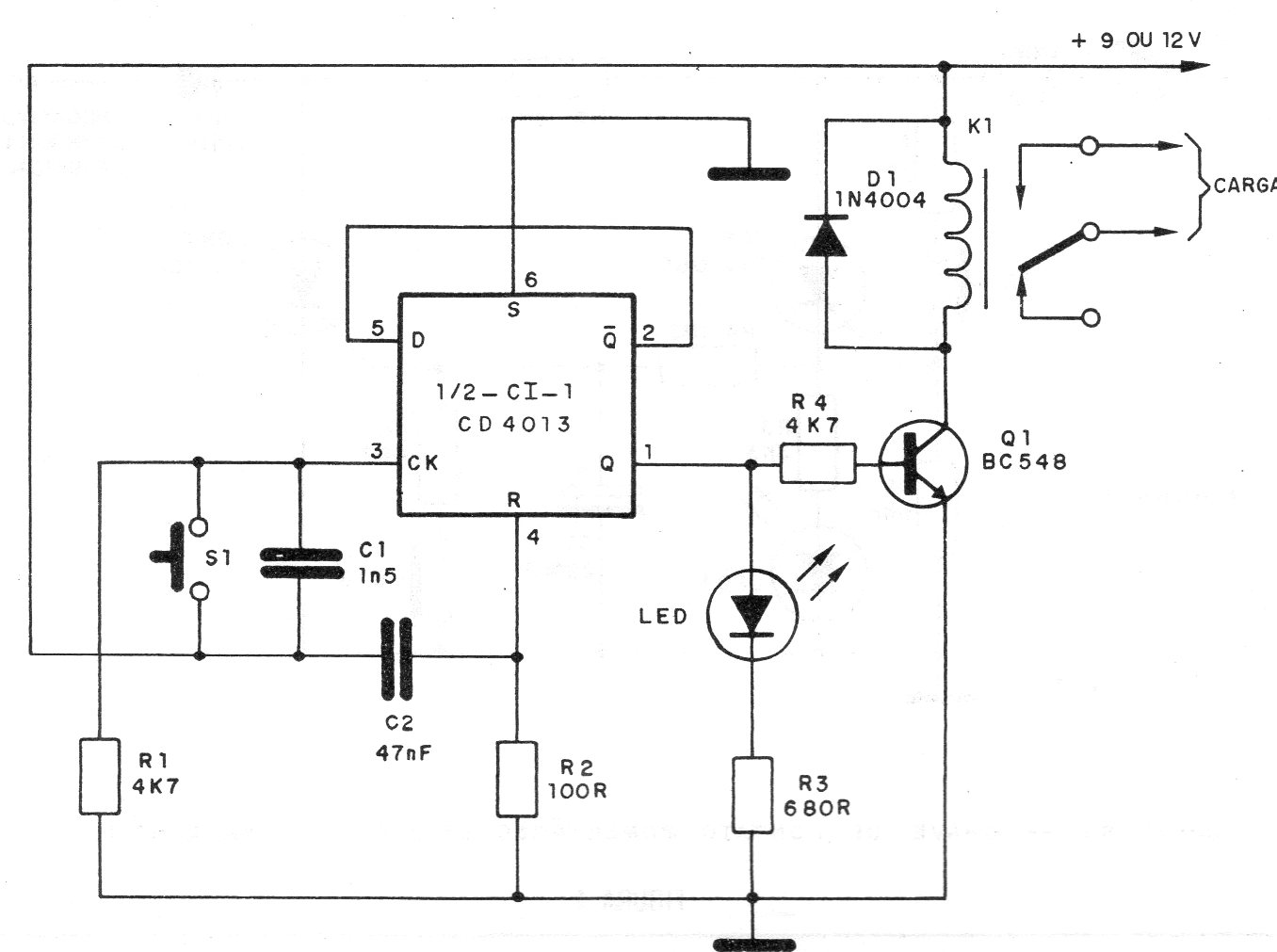 Este circuito biestable de tacto con tecnología CMOS controla un relé. La tensión de alimentación debe ser igual a la del relé. La carga controlada depende de los contactos del relé. El circuito es de una documentación antigua.