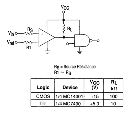 Se pueden utilizar otros circuitos de la serie (239 y 339). La configuración es del Handbook Linear Interfaz IC de Motorola de 1993. Los valores de los componentes para las dos lógicas están en la tabla. Este circuito se puede utilizar como shield para microcontroladores.