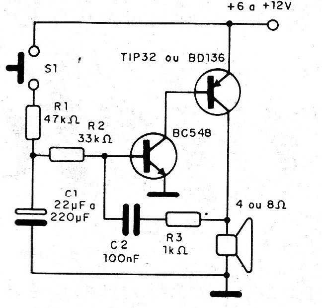 Este circuito ya incorpora la etapa de amplificación, pues el oscilador es del tipo de potencia, que puede excitar con hasta algunos watts un altavoz pesado. El transistor de salida puede ser el TIP32 o BD136, que debe estar dotado de radiador de calor. La modulación es del tipo manual. Presionando el interruptor de presión S1, el capacitor C1 se carga lentamente, polarizando así el oscilador, que inicia la operación con sonido grave y se va suavemente más agudo. Cuando el interruptor de presión se suelta, el capacitor se carga y el sonido pasa suavemente de agudo hasta que se detenga. El capacitor C2, de realimentación del circuito, determina la frecuencia media del sonido, junto con los resistores de carga y descarga. Dependiendo de la aplicación, los resistores pueden ser sustituidos por trimpots de 100 k ohms en serie con resistores de 10 k ohmios, y el capacitor puede tener valores entre 22 nF y 100 nF. De la misma forma podemos cambiar el tiempo de ascenso y descenso del sonido, o sea, el efecto de modulación, con la utilización de capacitores electrolíticos para C1 en el rango de 22 u a 220 uF.