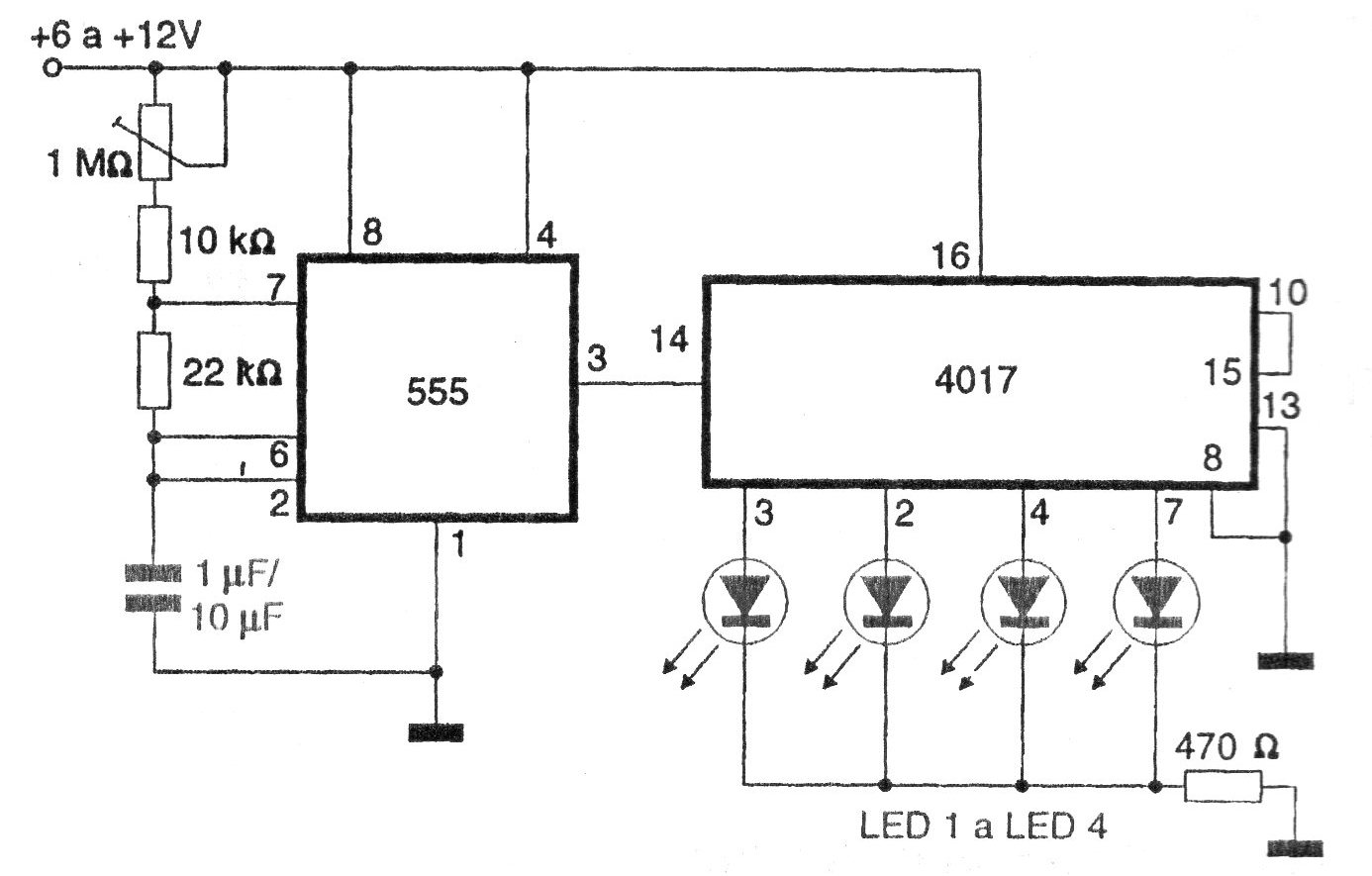Este sistema de LEDs secuenciales tiene su velocidad ajustada en un potenciómetro de 1 M ohms y esta velocidad depende básicamente del condensador conectado a los pines 2 y 6 del 555. La tensión de alimentación del circuito puede quedar entre 6 y 12 V y la resistencia de 470 Q determina el brillo de los LED.