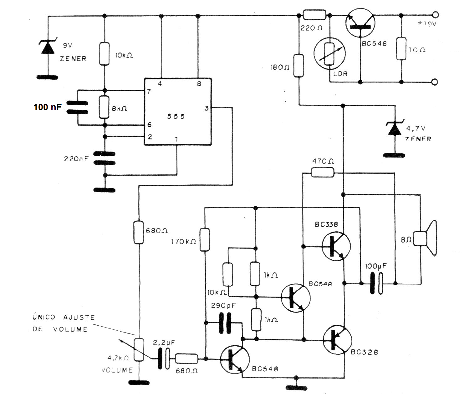 Este circuito de grillo obtenido en una documentación de 1992 tiene una etapa amplificadora que, sin embargo, quita el realismo del proyecto. El circuito tiene un control de volumen y una fuente que hace que entre en funcionamiento sólo cuando la luz se corta sobre el sensor. El circuito es alimentado por fuente de 12 V.
