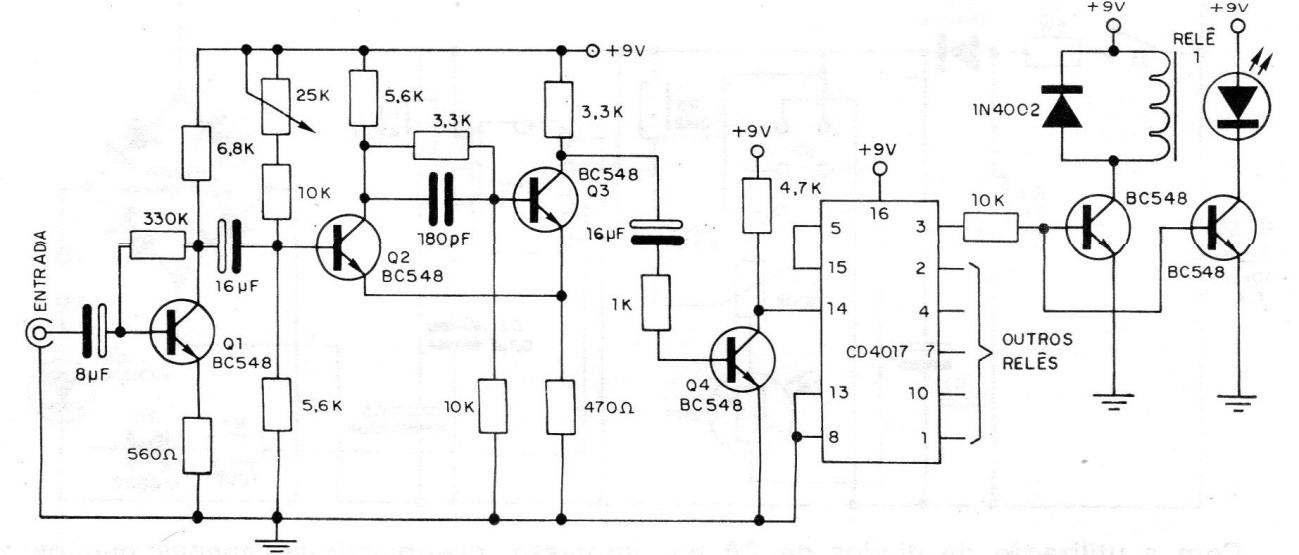 Excitando un circuito secuencial con la salida de un aparato de sonido podemos hacer un conjunto de lámparas correr a una velocidad variable, acompañando el ritmo de la música. Esta es la finalidad básica de este proyecto, en el que se modula el reloj de un sistema secuencial, transformando la onda de la salida de sonido de un receptor en picos rectangulares, capaces de excitar un integrado C-MOS del tipo 4017. Alimentando relés de alta potencia, se puede con un mínimo de potencia de audio controlar gran cantidad de lámparas, con la obtención de efectos especiales sensacionales. El 4017 como se sabe permite la obtención de un sistema secuencial de hasta 10 canales, y utilizando relés de 6A, eso significa una carga máxima de 60 A o 6600 W en 110 V o 13200 W en 220 V, lo que significa una potencia realmente sensacional.