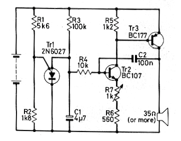 Este circuito apareció en una publicación inglesa de noviembre de 1982. La revista ya no existe, pero el circuito es viable a no ser por el componente básico que es un transistor programable unijuntura (PUT). En realidad, la finalidad del circuito hoy es didáctica mostrando cómo emplear en la práctica este componente poco común. El transistor NPN puede ser BC547 y el PNP el BC557. En este circuito el oscilador de relajación con el PUT modula un oscilador de audio formado por los otros dos transistores. La alimentación debe realizarse con tensión de 9 a 12 V. Para el altavoz se puede utilizar un altavoz de 8 ohmios en serie con una resistencia de 22 ohms, con un poco menos de volumen para el tono generado.