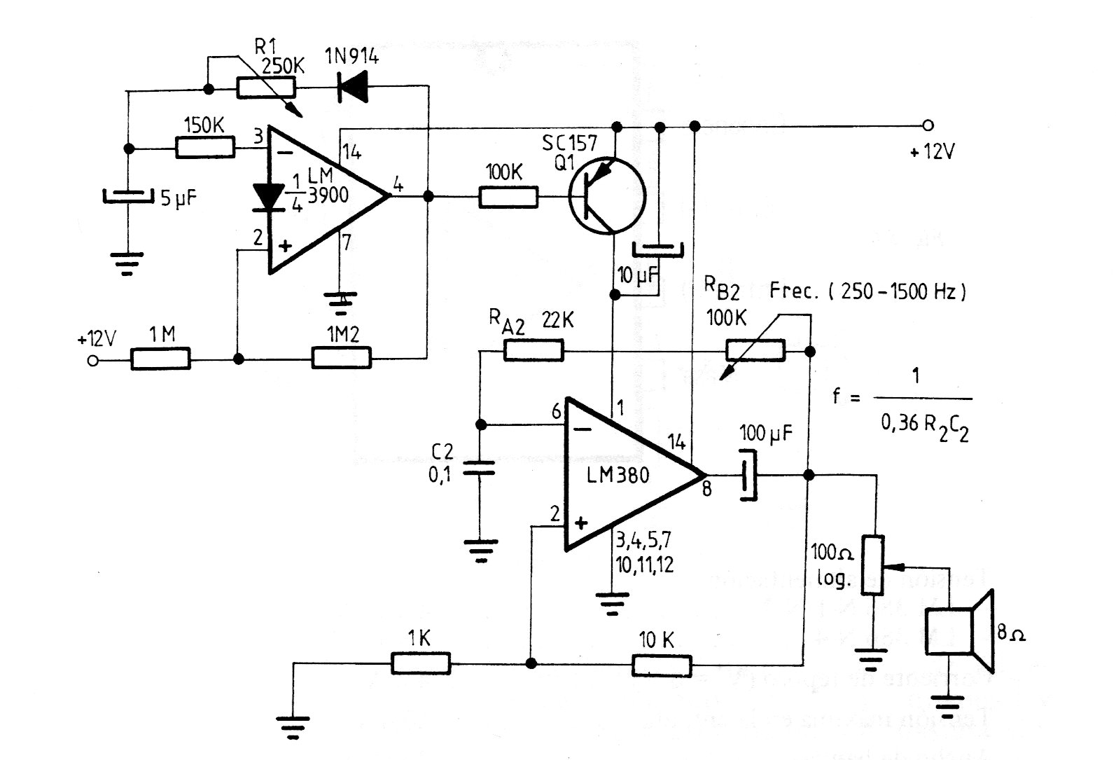 Este circuito es de un manual del propio LM380 de los años 70. El circuito integrado no es muy común debiendo ser cuidado con el sufijo que indica diferentes pinos para la misma envoltura. El circuito tiene ajuste de tono e intervalos y debe ser alimentado con 12 V. La potencia de salida es de poco más de 2 W.