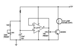 Este circuito controla el brillo de una luz de cortesía de coche con alimentación de 12 V. El transistor también puede ser el TIP42 en un radiador de calor. VR1 hace el control y VR2 el ajuste al punto máximo. El interruptor es el conectado a la puerta del vehículo. Se pueden utilizar amplificadores operacionales equivalentes. El circuito también funciona con tensiones más bajas.